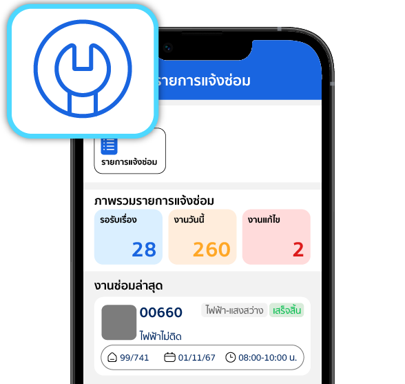 ระบบช่วยตรวจสอบรายงานการแจ้งซ่อม อัปเดตสถานะการซ่อมบำรุงได้ง่ายผ่านแอปฯบนมือถือและเว็บไซต์ ลดปัญหาการซ่อมบำรุงล่าช้า ติดตามสถานะการซ่อมไม่ได้ งานไม่คืบหน้า