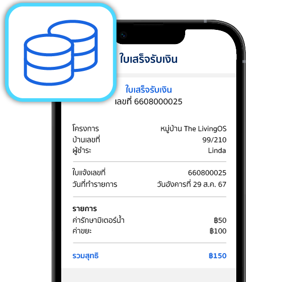 รับชำระ ออกใบเสร็จ เปิดใบเสร็จและออกใบเสร็จให้กับลูกบ้านผ่านแอปได้ทันทีที่ลูกบ้านชำระเงินตามรายการที่กำหนด สะดวก ง่าย และประหยัดเวลา หมดปัญหาการพิมพ์ใบเสร็จและจัดส่งให้ลูกบ้านแบบรายคน