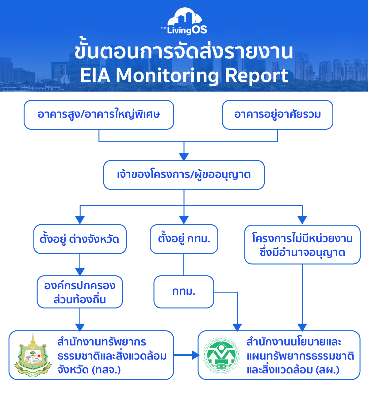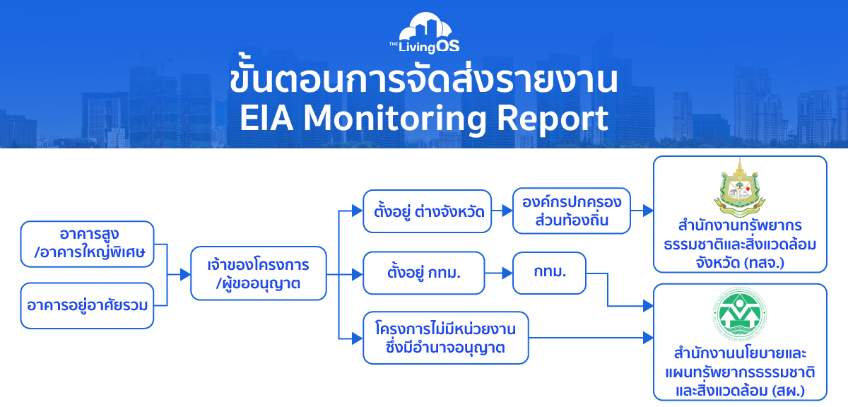 ‘การจัดทำรายงานและติดตามผลการปฏิบัติตามมาตรการป้องกันและแก้ไขผลกระทบสิ่งแวดล้อม’ ของโครงการอาคารหรือคอนโดที่กำลังเข้าสู่ขั้นตอนการก่อสร้างและดำเนินการ ซึ่งจะต้องมีการจัดทำรายงานการปฏิบัติตามมาตรการป้องกันที่ได้มีการระบุไว้ใน EIA (Environment Impact Assessment) ก่อนที่โครงการอาคารหรือคอนโด จะอยู่ในขั้นตอนการก่อสร้างและดำเนินการ และนำส่งรายงาน (EIA Monitoring Report) ให้กับสำนักงานนโยบายและแผนทรัพยากรธรรมชาติและสิ่งแวดล้อม (สผ.) เพื่อให้ทางหน่วยงานได้พิจารณาต่อไป