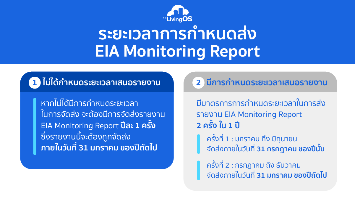 สำหรับวันและเวลา หรือความถี่ในการนำเสนอหรือจัดส่งรายงาน EIA Monitoring Report จะถูกแบ่งออกเป็น 2 กรณี