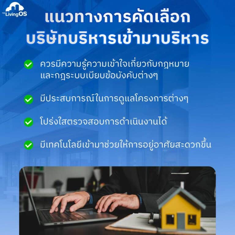 The LivingOS เราเป็นที่ปรึกษาในการสรรหาบริษัทบริหารคอนโด หมู่บ้าน เพื่อให้แต่ละโครงการได้บริษัทบริหารที่ตอบโจทย์ และเหมาะสมกับโครงการของคุณมากที่สุด เรามีประสบการณ์การสรรหาบริษัทบริหารคอนโด และหมู่บ้านมามากกว่า 1,000 โครงการ และมีเทคโนโลยีรองรับในการดำเนินงานเพื่อความโปร่งใส และสามารถตรวจสอบได้